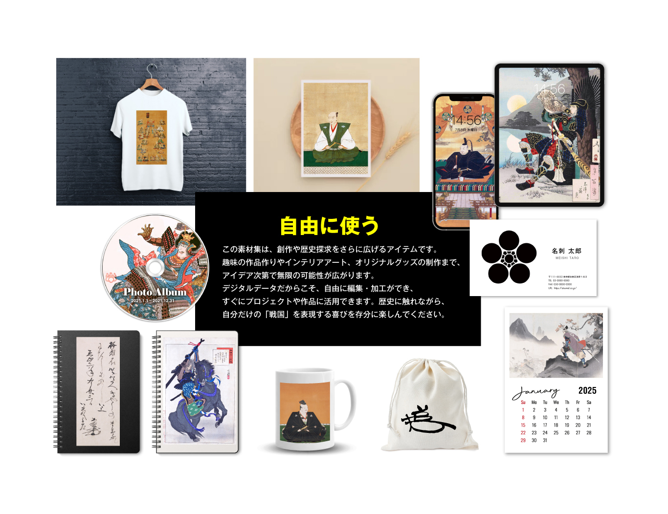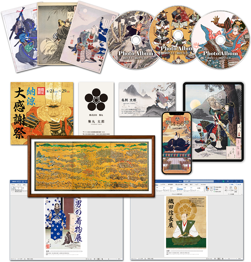Tシャツやグッズのデザイン素材としても使えるほか、伝統的な家紋の美しさを感じながらインテリアに活用することも可能です。