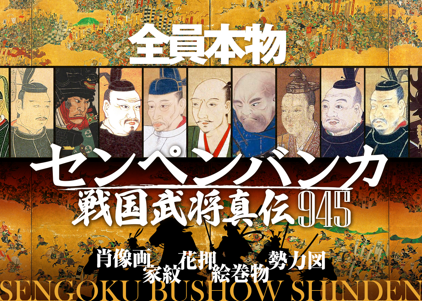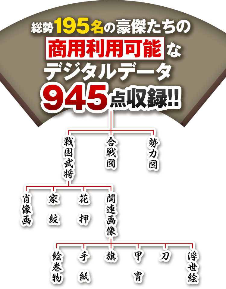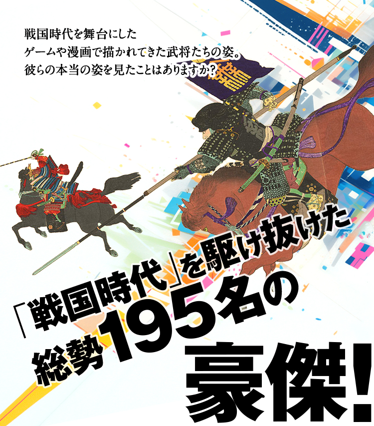 織田信長、豊臣秀吉、徳川家康、武田信玄、上杉謙信など、戦国時代の名将たちの肖像画195点を収録。