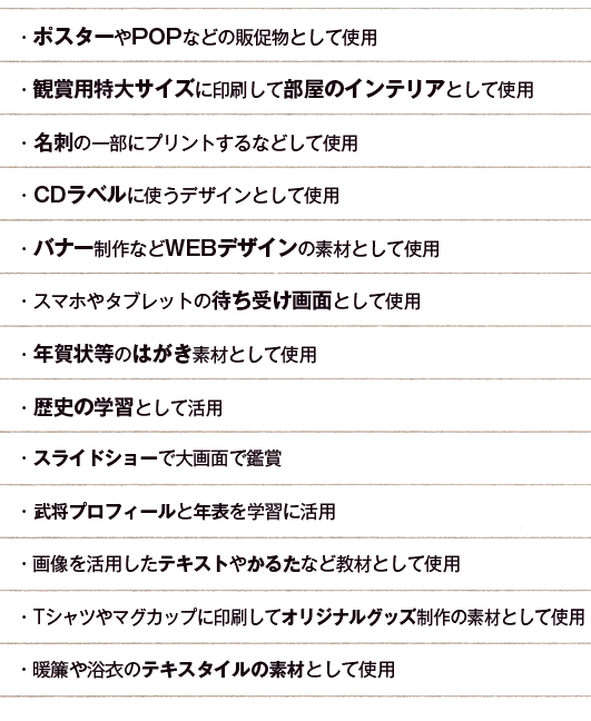 パブリックドメインとは、知的創作物についての、著作権をはじめとする知的財産権(知的所有権)が消滅した状態のことです。著作者の人格的利益を害する利用の制限などはありますが、本商品に収録の画像はすべて「パブリックドメイン」ですので、私的な利用はもちろん、商用利用するなど幅広い用途での使用が可能です。